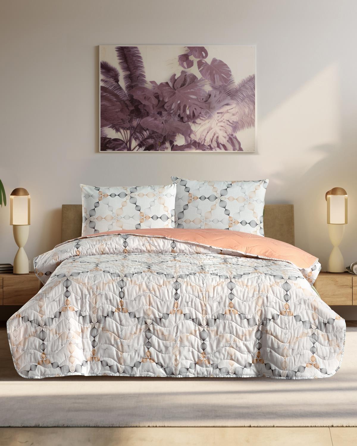Çift Kişilik Pamuklu Kapitone Pike & Yatak Örtüsü Somon / Beyaz
