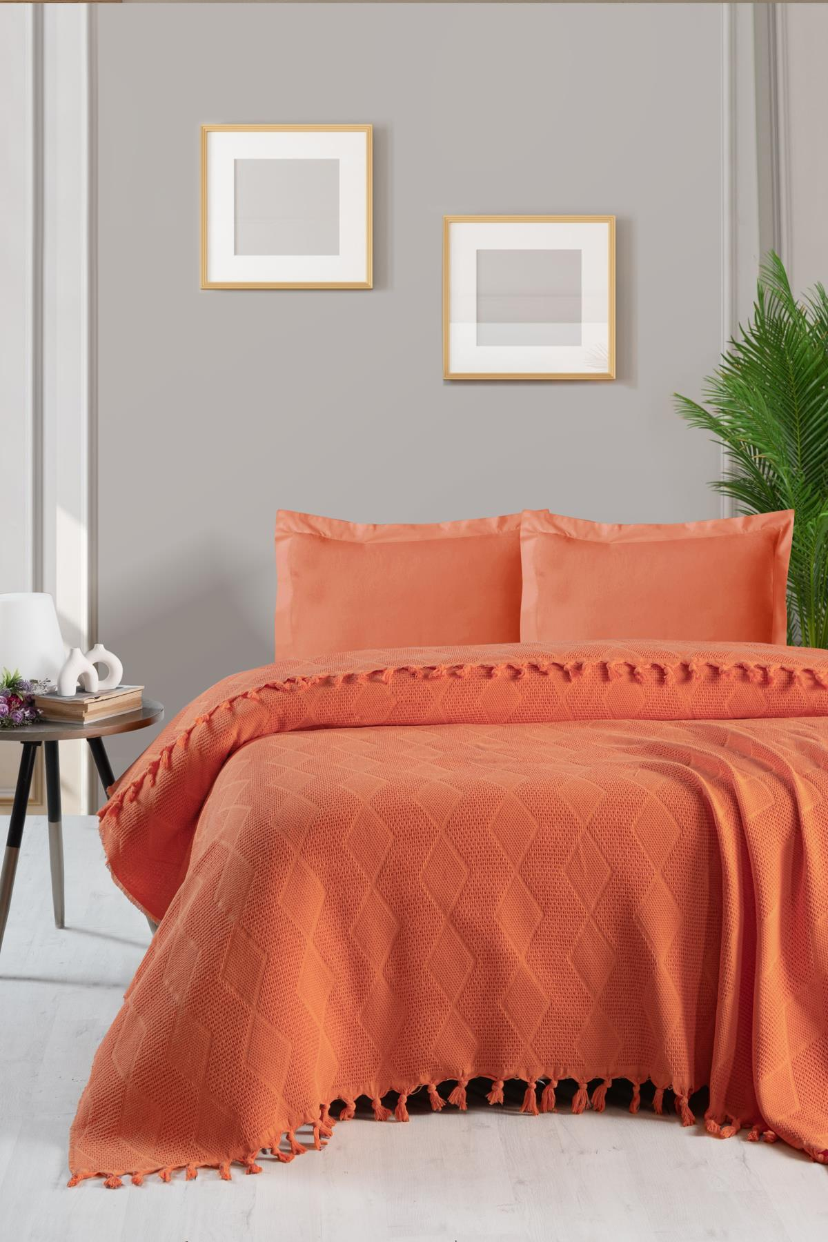 Çift Kişilik Turuncu Jakar Desen Pamuklu Pike/ 4 Mevsim