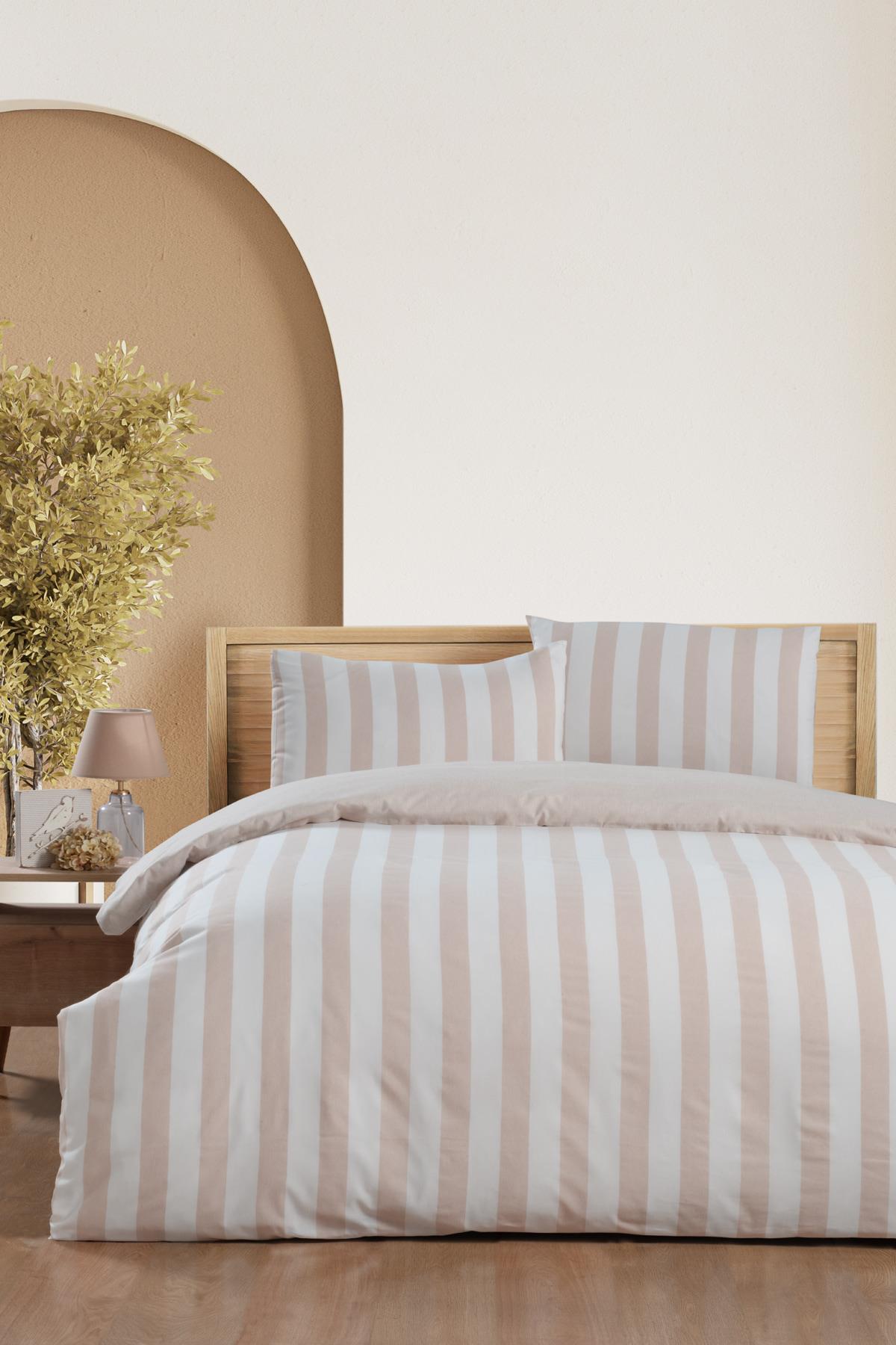 Heaven Lastikli Çarşaflı Nevresim Takımı Çift Kişilik Sütlü Kahve Çizgi Desen