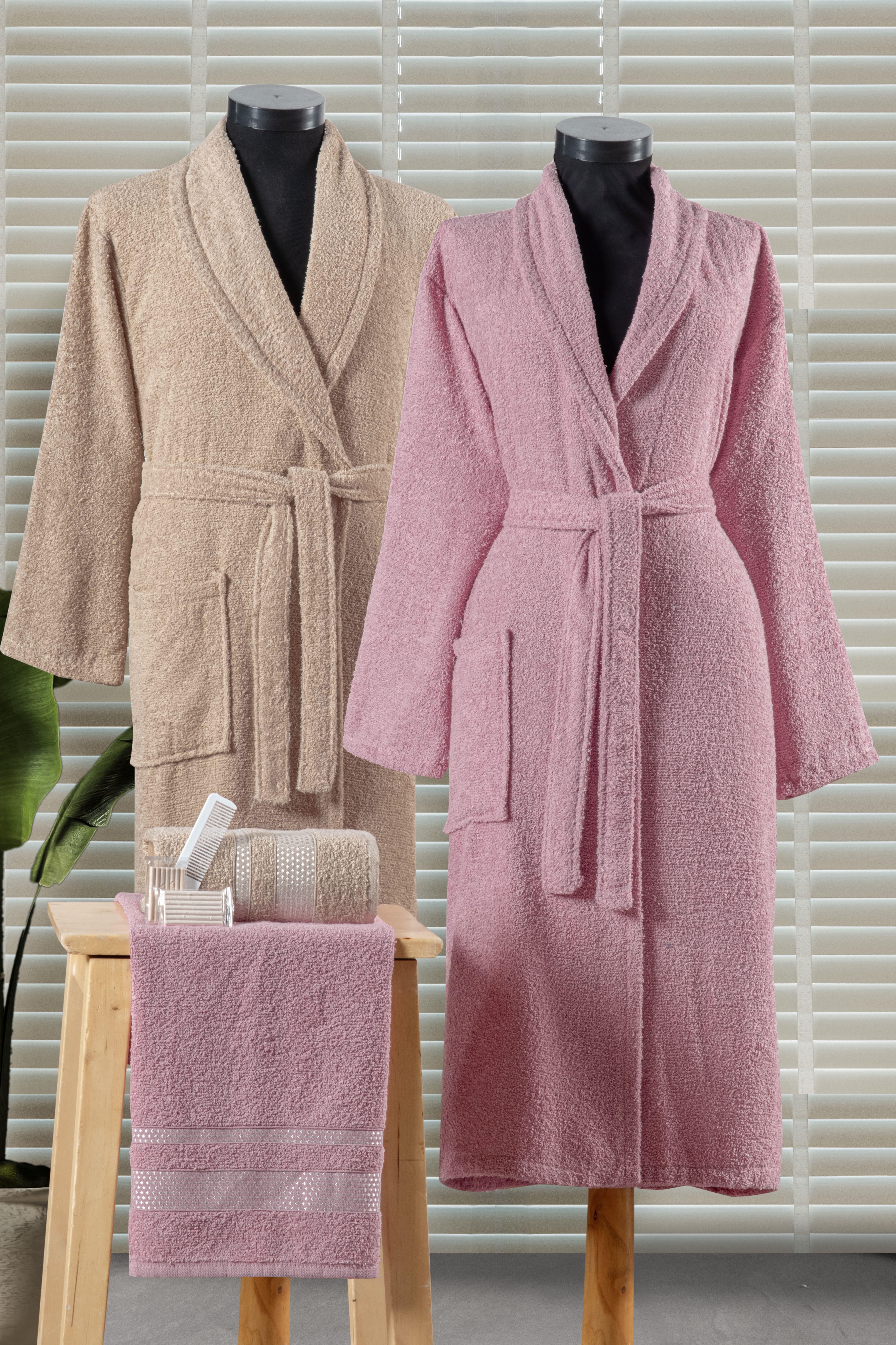 Set İçeriği: 2 Adet Bornoz, 2 adet 50x90 El ve Yüz Havlusu, 2 Adet Sabun, 2 Adet Tarak